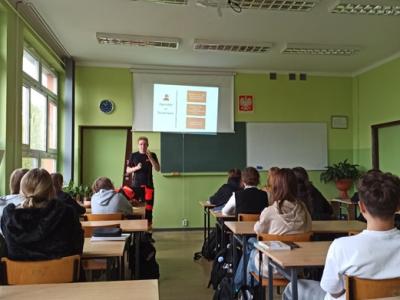 z ratownikiem medycznym Jakubem Grochowskim. Głównym celem ćwiczeń była umiejętność udzielania pierwszej pomocy osobie nieprzytomnej. Młodzież z dużym zaangażowaniem uczestniczyła w zajęciach, aktywnie udzielała odpowiedzi na zadawane pytania i chętnie wykonywała ćwiczenia.