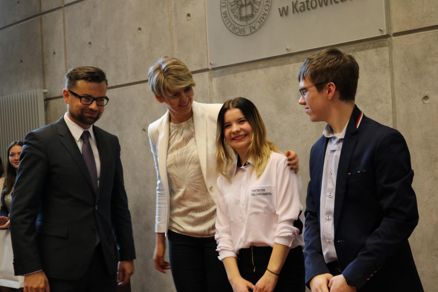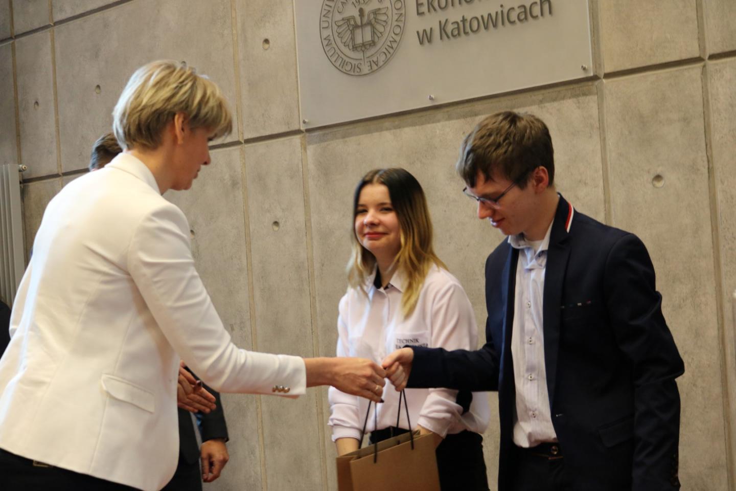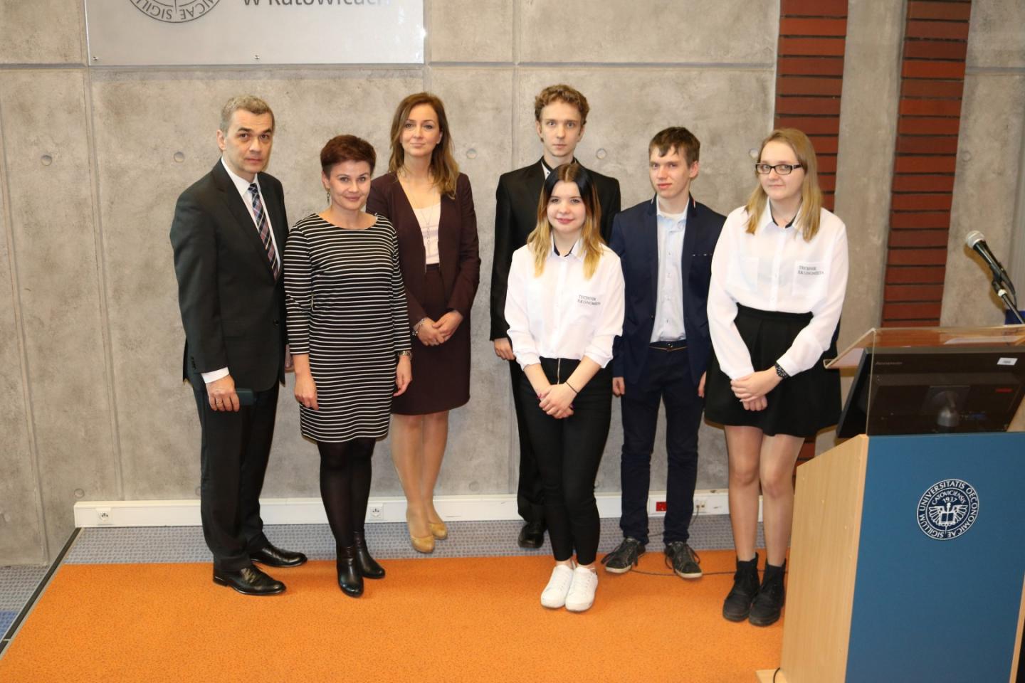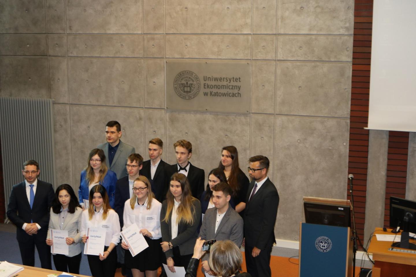 Celem konkursu było między innymi zachęcanie młodzieży do aktywności gospodarczej. Obserwując rywalizację 12 drużyn, które prezentowały swoje pomysły na biznes, śmiało można powiedzieć, iż młodym ludziom nie brakowało kreatywności i odważnych wizji własnej działalności gospodarczej. Zadaniem uczniów było nie tylko przygotowanie biznes planu i prezentacji, ale również publiczne przedstawienie swojego pomysłu i udzielanie odpowiedzi na pytania konkursowego jury. Z tym zadaniem doskonale poradziła sobie Agnieszka i Oskar prezentując biznesplan firmy GreenClean. Uczniowie zdobyli II miejsce oraz tablety ufundowane przez sponsorów konkursu. Na uwagę zasługuje również wystąpienie Mireli i Przemka (uczniów klasy pierwszej), którzy swoją swobodą wypowiedzi oraz spontanicznością szczególnie zainteresowali biznesplanem zgromadzoną na auli publiczność. Głównym organizatorem konkursu był Wydział Biznesu, Finansów i Administracji. Uniwersytetu Ekonomicznego w Rybniku. Współorganizatorami konkursu były również takie instytucje jak Urząd Skarbowy w Rybniku, ZUS o/Rybnik, Powiatowy Urząd Pracy w Rybniku, przedstawiciele biznesowi: Tenneco Sp. z o.o., PREVAC Sp. z o.o., Perfekt Sp. z o.o. i Izba Przemysłowo-Handlowa ROP oraz szkoły ponadgimnazjalne. Wydarzenie objęte zostało honorowym patronatem Prezydent Miasta Rybnika. Wszystkim drużynom gratulujemy! Małgorzata Lach Przeczytaj i dowiedz się więcej o wydarzeniu: