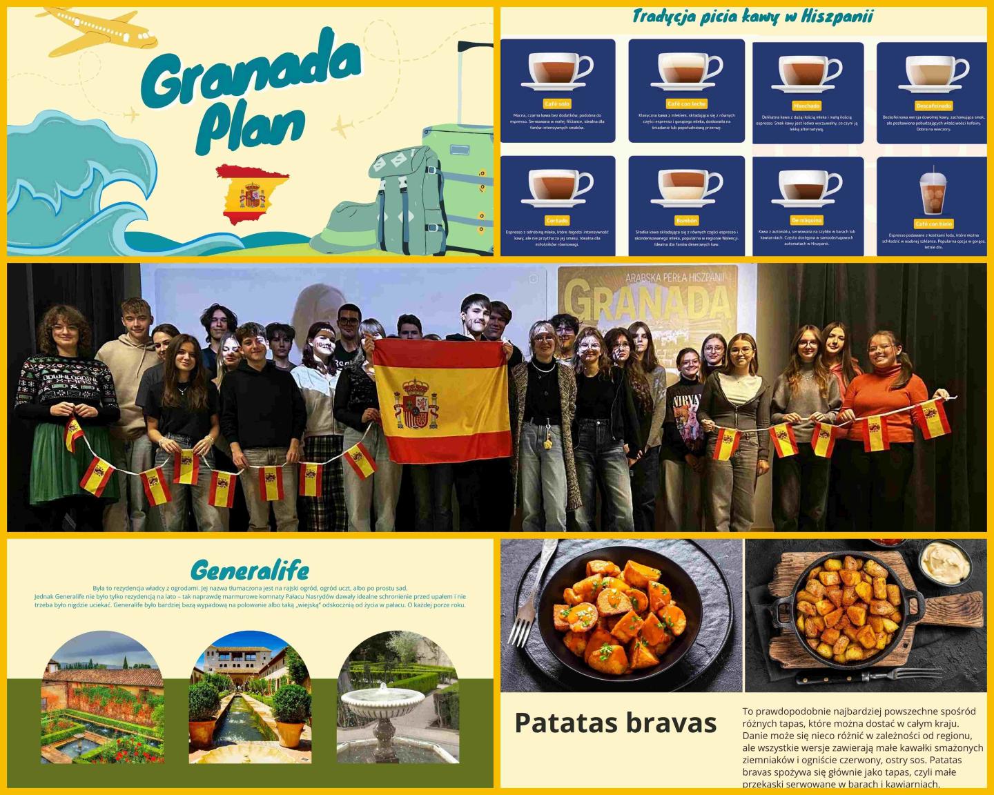Warsztaty przybliżyły stażystom najważniejsze informacje o Granadzie i regionie Andaluzji. Uczestnicy poznali położenie miasta, jego wyjątkowy klimat oraz różnorodność wynikającą z arabskich, chrześcijańskich i współczesnych wpływów. Omówiona została historia Granady, w tym dziedzictwo Alhambry i dawnej dzielnicy Albaicín. W trakcie zajęć stażyści zapoznali się również z najważniejszymi zabytkami, takimi jak Generalife, Pałac Nasrydów czy katedra. Kolejna część spotkania poświęcona była kulturze i tradycjom, w tym flamenco, lokalnym świętom oraz zwyczajom codziennego życia. Uczestnicy dowiedzieli się, jak funkcjonował hiszpański rytm dnia, czym była siesta oraz dlaczego kolacje często zaczynały się późno i trwały do nocy. Ważnym punktem warsztatów było wprowadzenie do hiszpańskiej kuchni, obejmujące tapas, paellę, gazpacho oraz słodkie churros. Stażyści poznali podstawowe normy społeczne i sposób komunikacji Hiszpanów, takie jak bezpośredniość, głośny sposób mówienia czy duża otwartość na rozmowę. Omówione zostały także popularne stereotypy i ich prawdziwość, aby przygotować młodzież na świadome i pełne szacunku uczestnictwo w lokalnej społeczności. Warsztaty zakończyły się przedstawieniem zasad pracy w Hiszpanii, rytmu dnia oraz specyfiki tamtejszych miejsc pracy, co pozwoliło uczestnikom poczuć się pewniej przed wyjazdem. |