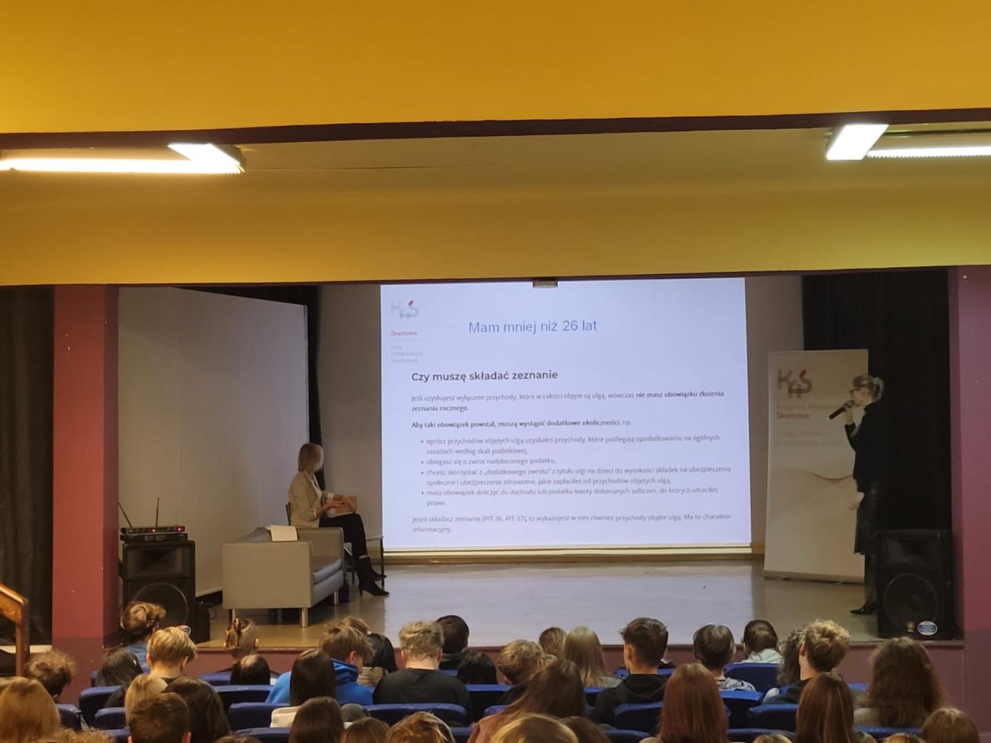 Uczniowie zostali zapoznani ze stroną podatki.gov.pl i funkcją „e-Urząd Skarbowy”, która umożliwia załatwienie wielu spraw online - na dowolnym urządzeniu, 24/7. Duże zainteresowanie wzbudziła także możliwość elektronicznego umówienia wizyty w Urzędzie Skarbowym. Młodzież miała również okazję poznać korzyści z posiadania profilu zaufanego. Jest to bezpłatna metoda potwierdzania naszej tożsamości w systemach podmiotów publicznych. A zatem posiadając profil zaufany można nie tylko załatwić sprawy online w urzędach skarbowych, ale również w urzędach miejskich, gminnych czy sądach. Każdy z nas wcześniej czy później zawita do Urzędu Skarbowego, dlatego warto wiedzieć, w jaki sposób funkcjonuje Fiskus i jak prawidłowo załatwiać w nim swoje sprawy. Dziękuję p. Dariuszowi Gruszczykowi za pomoc techniczną podczas prelekcji. Małgorzata Lach |