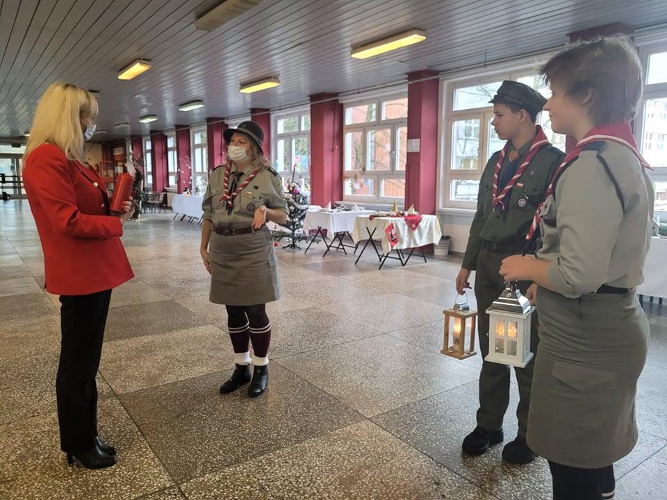 W imieniu społeczności „Korfantego” światełko odebrała dyrektor Ewa Mentel, która podziękowała za tak szczególny dar. - To już tradycja naszej szkoły, że przed Świętami Bożego Narodzenia gościmy w swoich murach Betlejemskie Światełko Pokoju. W dobie pandemii ma ono wyjątkowe przesłanie – ciepła, miłości, pokoju i nadziei w tym trudnym dla nas czasie. Niech Święta Bożego Narodzenia będą w każdym z nas zarówno w czasie Świąt jak i przez cały 2022 rok - mówiła dyrektor Ewa Mentel. Harcerze wraz z druhną Janiną Bogusz-Wiśniewską życzyli uczniom i pracownikom „Korfantego” spokojnych Świąt Bożego Narodzenia i Szczęśliwego Nowego Roku. Katarzyna Barczyńska-Łukasik |