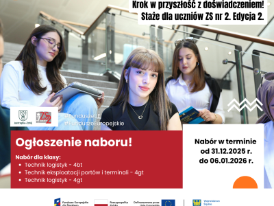 31 grudnia 2025 roku oficjalnie rusza druga edycja projektu: „Krok w przyszłość z doświadczeniem! Staże dla uczniów ZS nr 2. Edycja 2”, która potrwa do 31 grudnia 2028 roku.