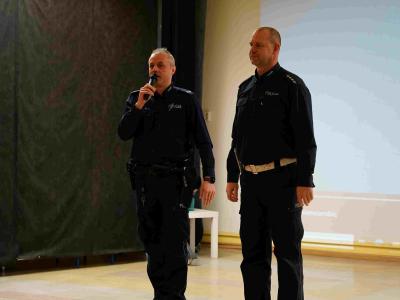 Starszy sierżant Grzegorz Suwisz oraz aspirant sztabowy Mariusz Kapała z Komendy Miejskiej Policji w Jastrzębiu-Zdroju przeprowadzili prelekcję dla uczniów klas pierwszych i drugich, podczas których zaprezentowali materiał edukacyjny o bezpiecznym poruszaniu się w sieci, przestrzegli młodzież przed nieodpowiedzialnym zachowaniem na drodze, pouczyli o odpowiedzialności karnej wśród nieletnich.