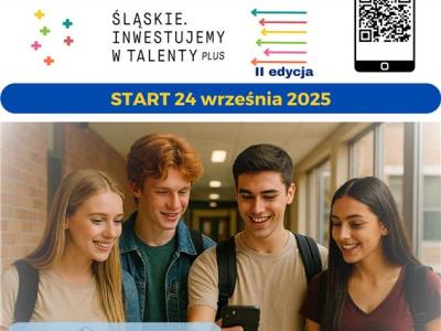 Uprzejmie informuje, iż w dniu 24 września 2025 r. rozpoczął się nabór wniosków o przyznanie stypendium w ramach projektu „Śląskie. Inwestujemy w talenty PLUS - II edycja”, realizowanego przez Województwo Śląskie w ramach Programu Fundusze Europejskie dla Śląskiego 2021 – 2027.