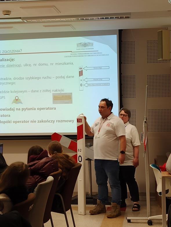 CPR w Katowicach jest największym Centrum w kraju. Obsługę zgłoszeń alarmowych rozpoczęło 1 października 2013 roku. Młodzież podczas zajęć dowiedziała się, do czego służy numer alarmowy 112 i jakie zdarzenia orazsytuacje można zgłaszać na numer alarmowy. Prowadzący omówili również słupki pikietażowe znajdujące się przy drodze, które pozwalają określić położenie w trasie, zwłaszcza poza terenem zabudowanym. Jest to szczególnie ważne w przypadku wypadku drogowego czy awarii samochodu. W górnej części słupka, nad elementem odblaskowym umieszczony jest numer drogi (drogi krajowe i wojewódzkie), pod elementem odblaskowym znajduje się kilometr danej drogi, a na samym dole słupka kolejny 100-metrowy odcinek danego kilometra. Młodzież dowiedziała się również, że numer 112 obsługuje zgłoszenia na przejazdach kolejowych i zgłoszenia E-Call, a dla osób głuchoniemych jest aplikacja Alarm 112. Młodzież pod czujnym okiem operatorów numeru 112 wykonywała resuscytację krążeniowo-oddechową. Dziękujemy operatorom numeru 112 za przekazanie wielu cennych informacji i wskazówek. Bożena Araszczuk Iwona Cieśla Anna Pancherz |